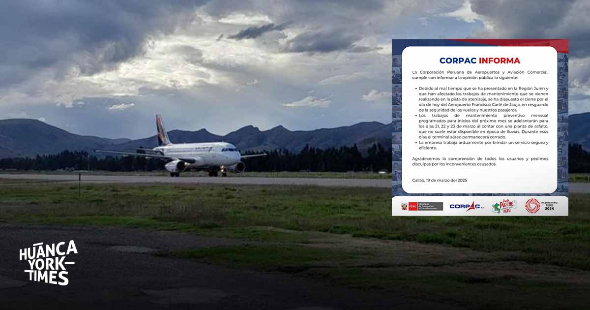El Aeropuerto Francisco Carlé de Jauja ha registrado más de 15 días de cierre debido a condiciones climáticas adversas y trabajos de mantenimiento en la pista de aterrizaje.