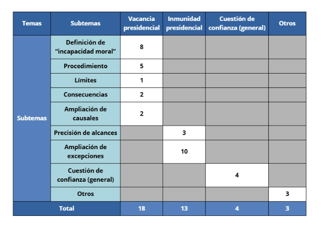 Así, los principales artículos de la Constitución Política del Perú que buscaron ser regulados fueron el 113 y 117, enfocándose tanto en la definición de “incapacidad moral” (8) como en los medios para su concreción mediante propuestas de vacancia presidencial (18), inmunidad presidencial (13) y cuestión de confianza (4). Esta asimetría tiene implicancias sustantivas. En lugar de fortalecer un sistema de pesos y contrapesos más claro, las propuestas procuran inducir un desequilibrio en favor del Parlamento, preservando sus márgenes de intervención sobre el Ejecutivo.