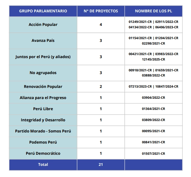 En la revisión de propuestas de reforma constitucional en el periodo parlamentario 2021-2026, identificamos 21 proyectos de ley que buscaron modificar estas dos instituciones. Como se ve en el siguiente cuadro, todas las bancadas tuvieron iniciativas similares con vistas a definir/reforzar la figura de la vacancia presidencial y presentaron propuestas.