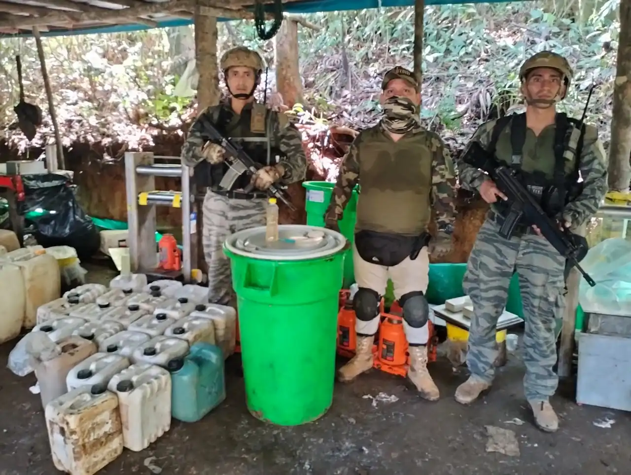 Al llegar al complejo clandestino, los agentes antidrogas vieron que contaba con dos ambientes rústicos construidos con materiales de la zona, como palos, plásticos, sogas, tablas y hojas. En el interior, se encontraron gran cantidad de drogas e insumos químicos utilizados en la producción de cocaína.