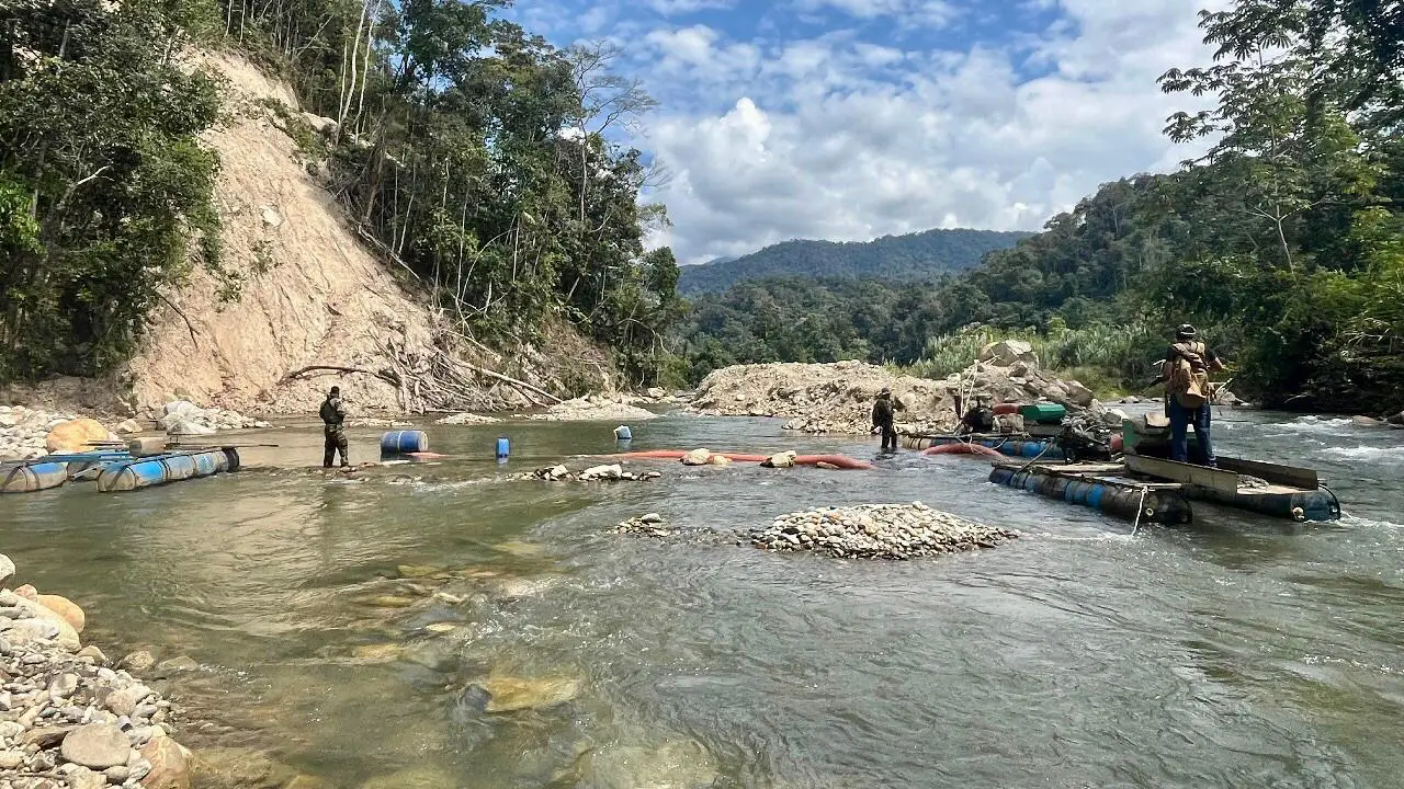 Además del laboratorio, la policía halló dos dragas mineras construidas con cilindros metálicos y motores industriales. La Fiscalía Especializada en Materia Ambiental dispuso su destrucción tras confirmar su vínculo con redes de minería ilegal que operan en coordinación con organizaciones narcotraficantes.