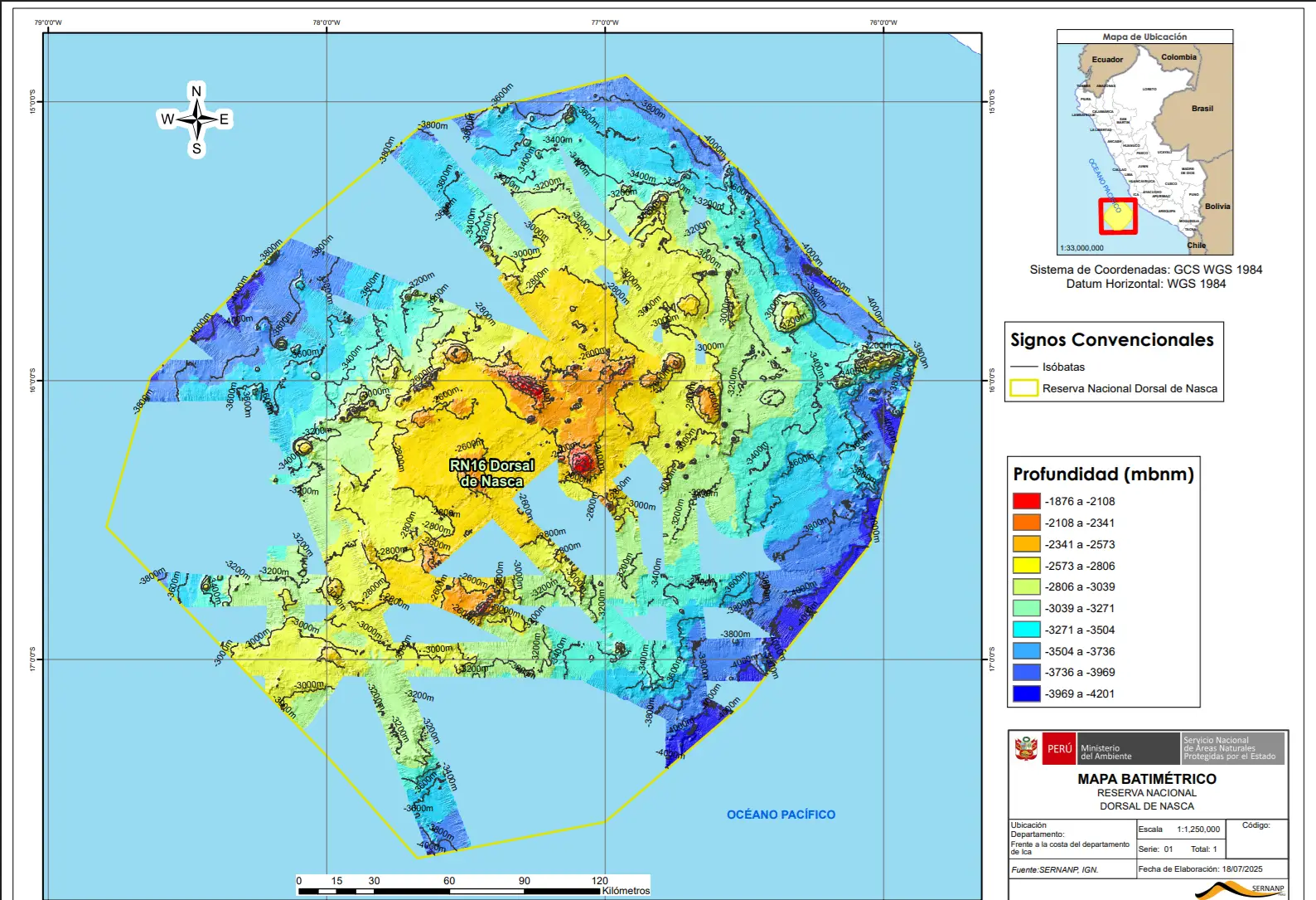 El estudio, desarrollado gracias a una alianza estratégica entre el Servicio Nacional de Áreas Naturales Protegidas por el Estado (Sernanp), el Instituto del Mar del Perú (IMARPE), la Dirección de Hidrografía y Navegación de la Marina de Guerra del Perú, y con la colaboración de la Fundación Re:Wild, analizó 1603 archivos batimétricos obtenidos por 19 cruceros de investigación nacionales e internacionales desde 1994.