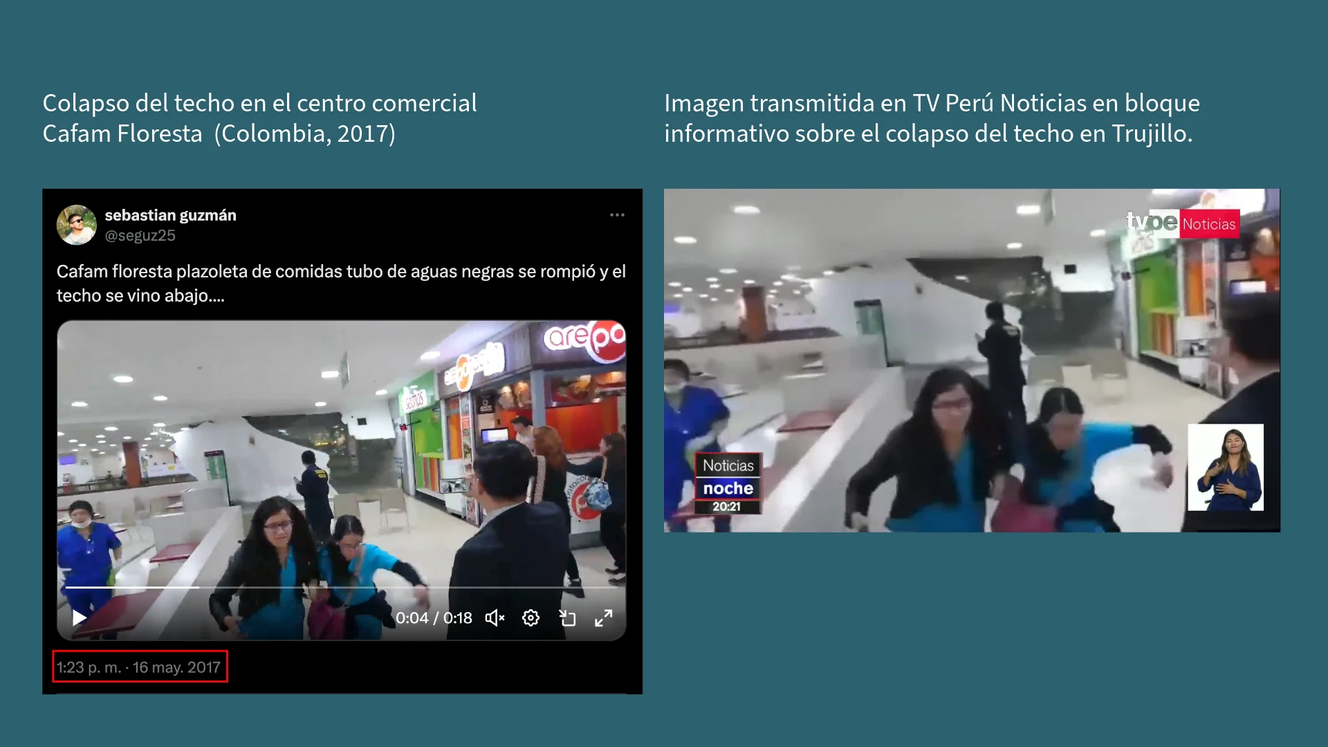 En el minuto 20:59, TV Perú Noticias mostró un video donde se observa la caída del techo en un centro comercial, acompañado de la siguiente voz en off: “Intercorp expresó sus condolencias a las familias de las víctimas y heridos”.