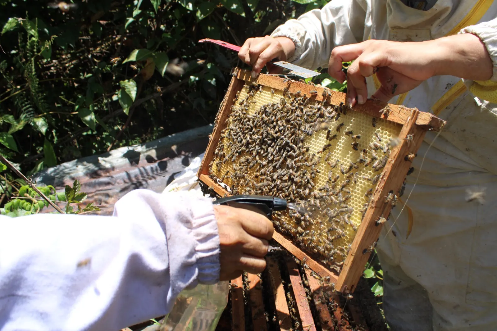 Los técnicos del Proyecto Apícola, que ejecuta el Gobierno Regional de San Martín (Goresam) a través de la Dirección Regional de la Producción (DIREPRO), realizaron visitas a los apiarios afectados, donde aplicaron una serie de tratamientos destinados a reducir los efectos de la intoxicación en las abejas. Una de las intervenciones fue la aplicación de una mezcla de vinagre de manzana y agua en las cámaras de cría de las colmenas, utilizando un aspersor. Este tratamiento, que actúa como un probiótico natural, tiene como objetivo mejorar la salud de las abejas y reducir la mortandad.