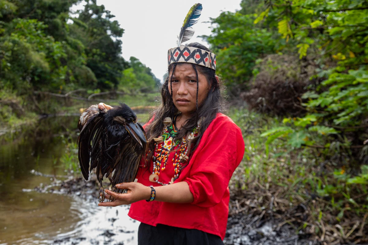 Olinda de la Cruz, de la comunidad Monterrico, junto a una garza cucharón que se encontró empapada de petróleo en el lugar del derrame. (Foto: Ginebra Peña / Mongabay)