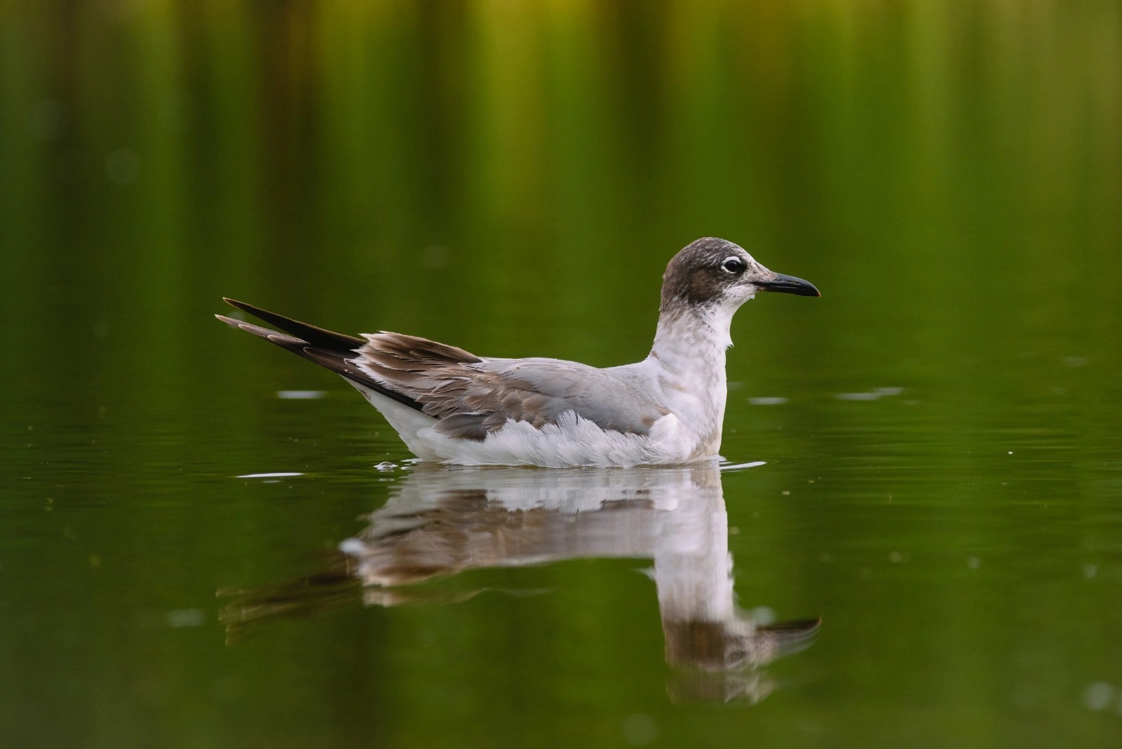 La gaviota de Franklin mide aproximadamente 36 centímetros y pesa cerca de 250 gramos. Su plumaje es blanco con ligeros tonos rosados en el pecho, dorso gris y anillo ocular blanco. Durante la temporada reproductiva, los adultos presentan pico y patas rojizas y cabeza completamente negra.