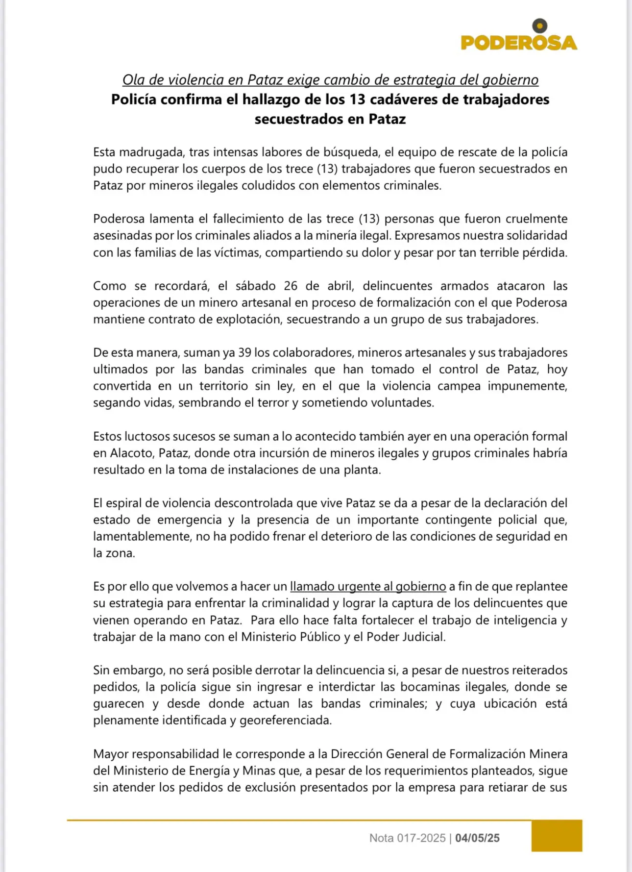 En su pronunciamiento ante lo ocurrido en Pataz, la minera Poderosa, también advirtió que “las reiteradas ampliaciones del Reinfo han servido de manto protector para que los mineros informales/ilegales sigan desarrollando sus actividades impunemente como parte de un proceso que ha demostrado ser un total fracaso (…) la minería ilegal se ha convertido en la principal economía ilícita del Perú, con un rastro de violencia, contaminación y muerte”.