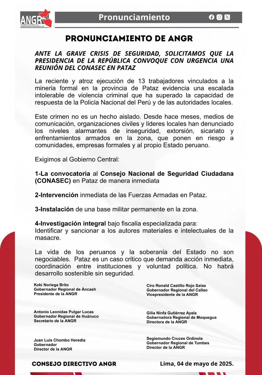 El 4 de mayo, la ANGR emitió un comunicado en respuesta a la masacre de 13 trabajadores en Pataz, exigiendo acciones inmediatas del Gobierno Central para enfrentar la creciente crisis de seguridad en la zona. En su pronunciamiento, los gobernadores pidieron una convocatoria urgente del Consejo Nacional de Seguridad Ciudadana (CONASEC) en Pataz, para abordar la escalada de violencia que ha sobrepasado la capacidad de respuesta de las autoridades locales y nacionales.