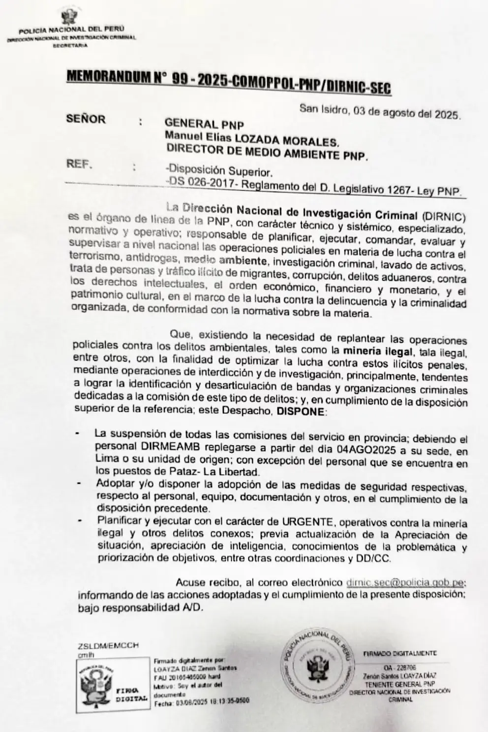Según el documento firmado por el teniente general Zenón Loayza, jefe de la Dinincri, la decisión busca “replantear las operaciones policiales contra los delitos ambientales” y optimizar la lucha enfocándose en la identificación y desarticulación de organizaciones criminales. Sin embargo, para las entidades firmantes del pronunciamiento público, esta acción implica graves riesgos ambientales y sociales.