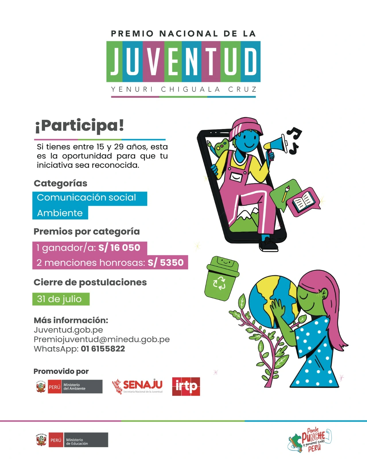 Para mayor información y bases, los interesados pueden consultar el portal www.juventud.gob.pe o comunicarse al correo premiojuventud@minedu.gob.pe y al WhatsApp (01) 6155822.