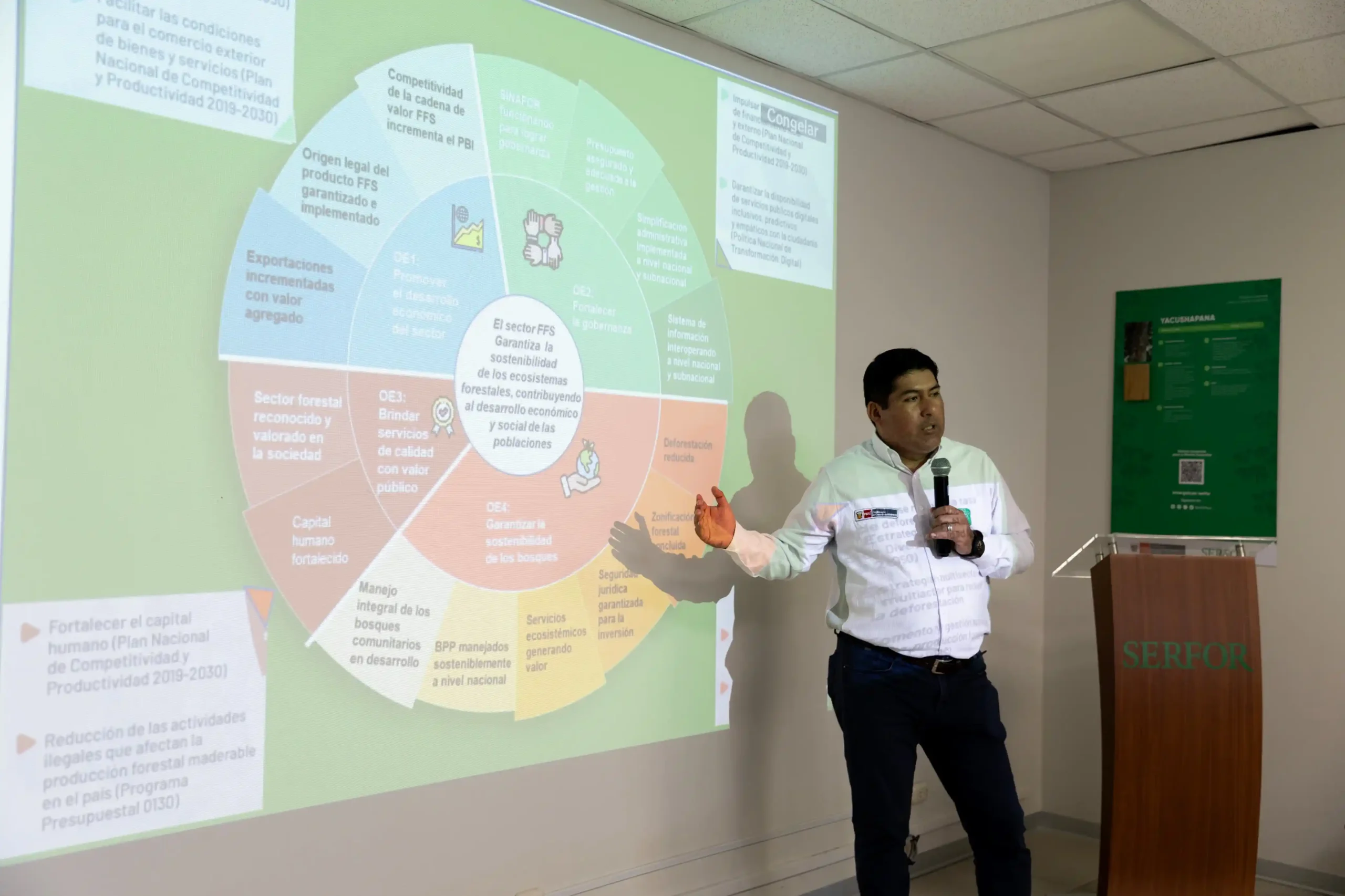 Por su parte, el jefe ejecutivo del Serfor, Erasmo Otárola, detalló que la estrategia se estructura en cuatro objetivos principales: promover el desarrollo económico del sector, fortalecer la gobernanza, brindar servicios de calidad con valor público y garantizar la sostenibilidad de los bosques. Cada una de estas metas contará con indicadores de seguimiento.