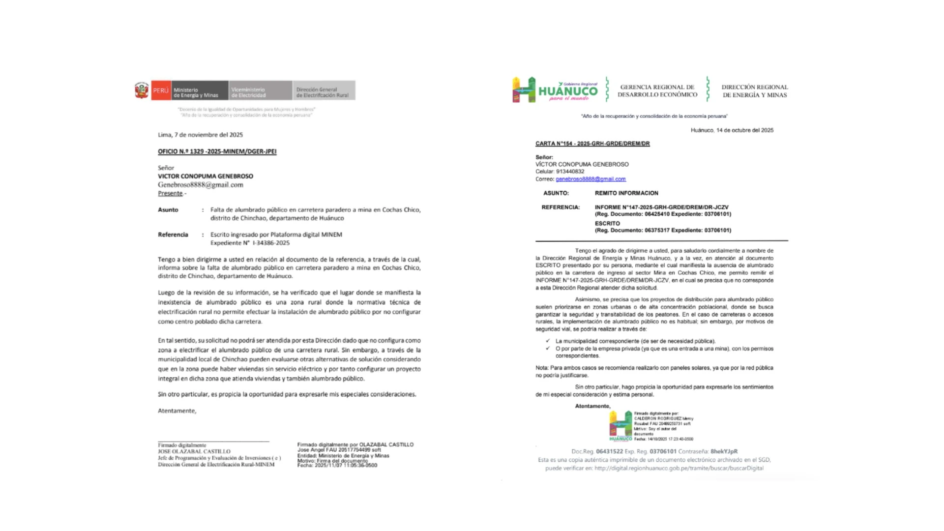 El Ministerio de Energía y Minas, a través de la Dirección General de Electrificación Rural, también respondió al reclamo mediante el Oficio N.° 1329-2025-MINEM/DGER-JPEI, emitido el 7 de noviembre de 2025. En este documento se indica que el tramo denunciado corresponde a una zona rural que no califica como centro poblado, por lo que la normativa técnica de electrificación rural no permite la instalación de alumbrado público en carreteras de ese tipo.