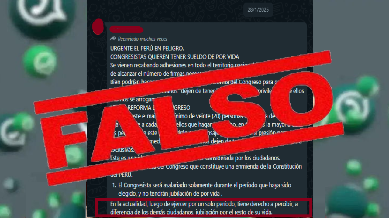 En los últimos días, un mensaje ha circulado masivamente a través de la red social de mensajería instantánea WhatsApp, afirmando que los congresistas peruanos, tras ejercer un solo período, tienen derecho a una jubilación de por vida o pensión vitalicia.
