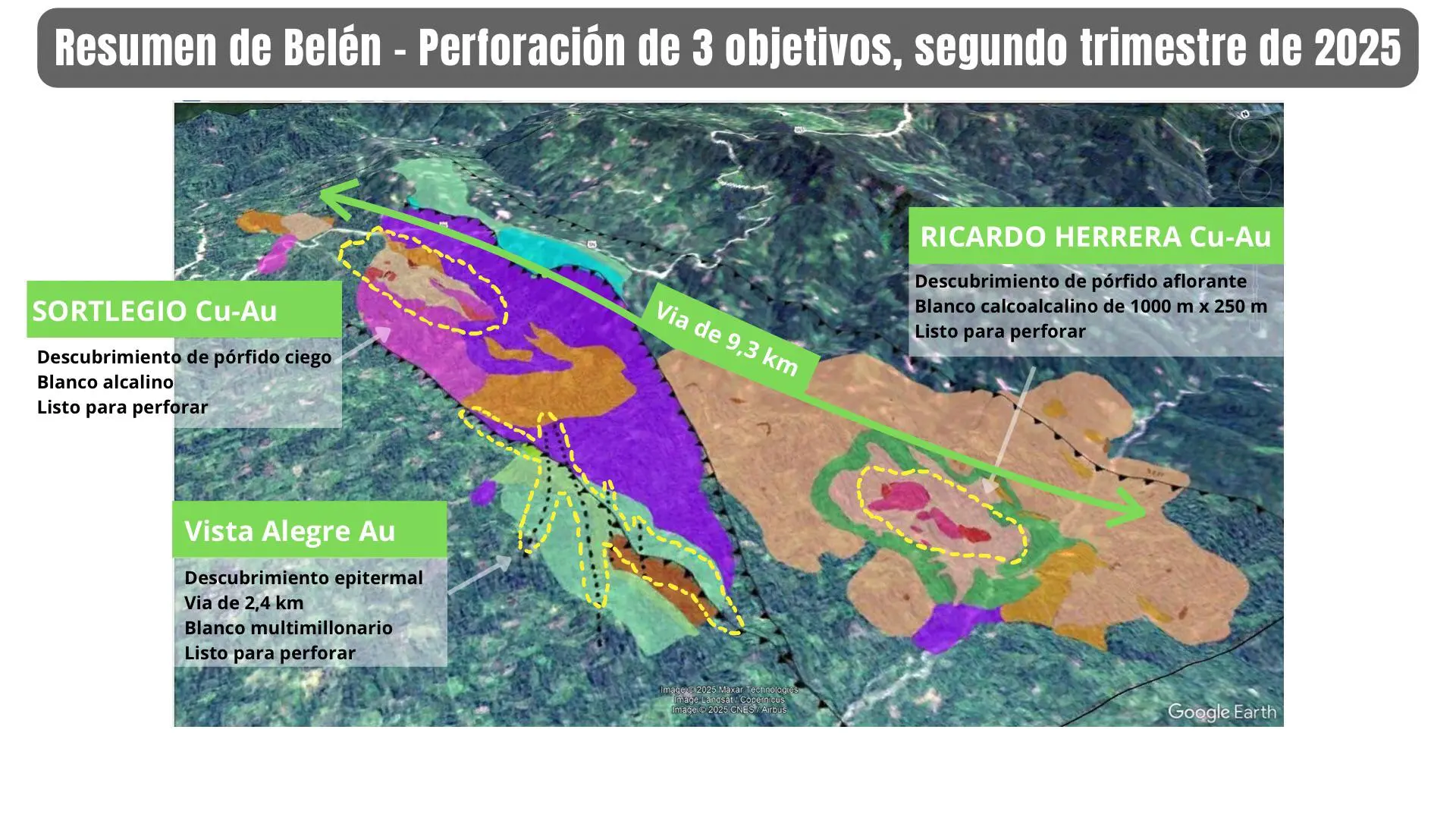 Belén representa alrededor del 4% del área total concesionada. Allí se han identificado 18 sistemas pórfidos y epitermales. Entre los más relevantes destacan Ricardo Herrera, con una anomalía de 1 km por 250 metros y afloramientos de cobre y oro; Vista Alegre, con una anomalía geofísica de 2,4 km y ensayes de hasta 1,98 g/t de oro; y Sortilegio, con un sistema de vetas tipo stockwork.