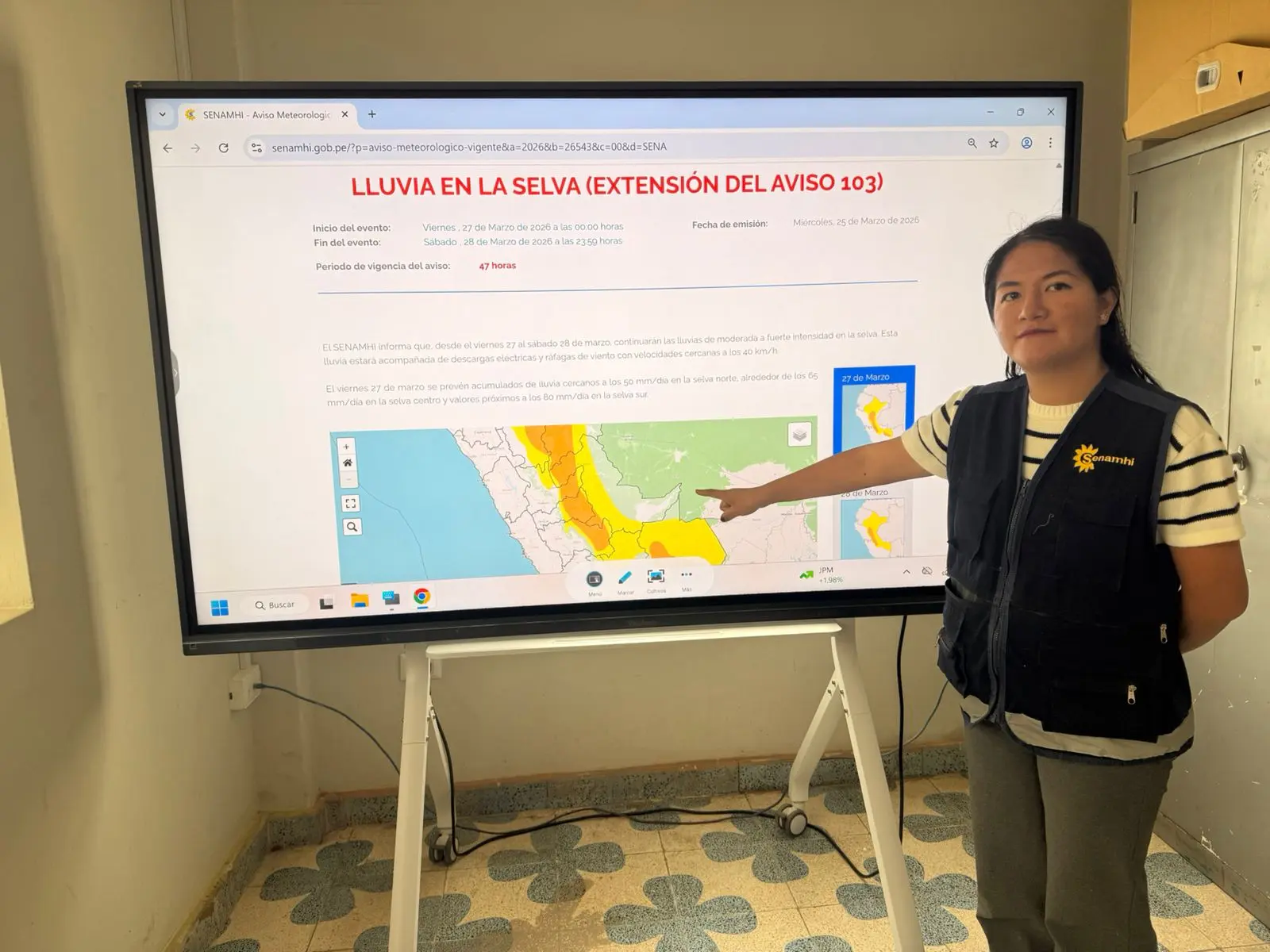 El pronóstico indica que las lluvias en la sierra continuarán hasta el 27 de marzo con intensidad moderada, mientras que en la selva se prevén precipitaciones entre moderadas y fuertes hasta el 30 de marzo, bajo el aviso meteorológico vigente de nivel naranja.