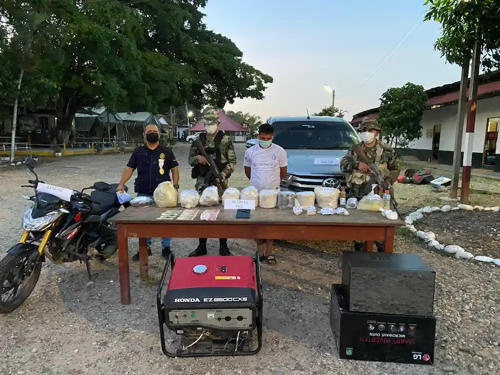 En la tolva de la camioneta se encontraron dos costales con diez paquetes que contenían una sustancia rocosa compatible con pasta básica de cocaína, con un peso total de 39 kilogramos. Además, se incautaron tarjetas bancarias, licencias de conducir y otros documentos personales del detenido.