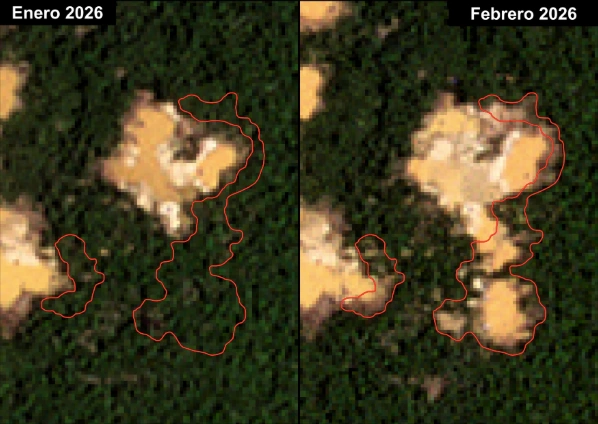Un nuevo reporte de la plataforma RAMI confirma que la minería de oro sigue avanzando en distintas zonas de la Amazonía peruana. A partir del análisis de imágenes satelitales de radar desarrolladas por Conservación Amazónica (ACCA), el monitoreo de febrero de 2026 muestra nuevas áreas donde el bosque ha sido afectado, tanto dentro como fuera del corredor minero del sur del país, así como la presencia de infraestructuras mineras en el norte amazónico.