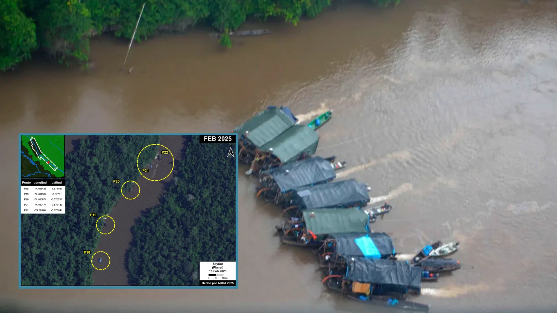 RAMI también identificó actividad minera en la Amazonía norte. En el río Nanay, en Loreto, se reportaron 35 nuevas infraestructuras mineras en febrero. Imágenes satelitales revelan balsas operando a lo largo de la ribera y en bancos de arena. En diciembre, la misma plataforma detectó 41 dragas en este río.
