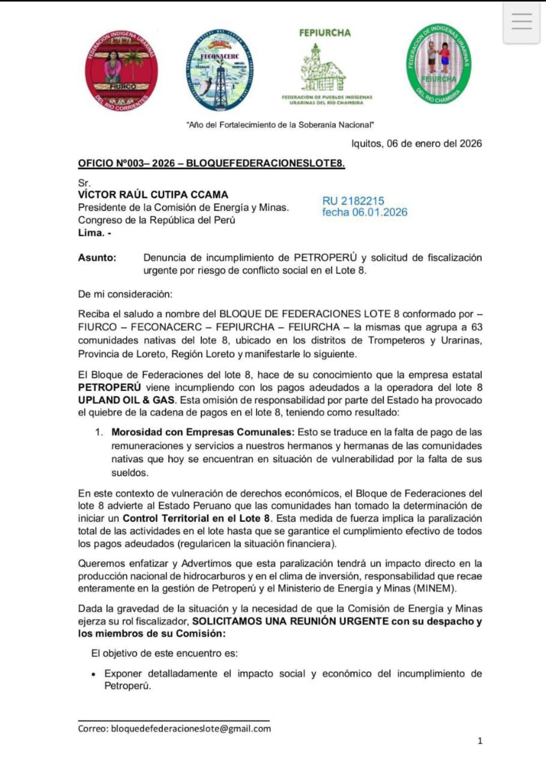 El Bloque de Federaciones del Lote 8 denunció ante la Comisión de Energía y Minas del Congreso el incumplimiento de pagos de Petroperú a la operadora Upland Oil & Gas, situación que ha generado una cadena de morosidad que afecta directamente a empresas comunales y a las familias de 63 comunidades nativas ubicadas en los distritos de Trompeteros y Urarinas, en la región Loreto.