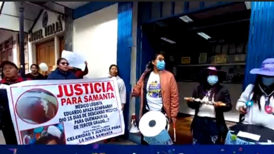 Colectivos feministas, vecinos de Salcedo y padres de familia se movilizaron frente al Ministerio Público para exigir justicia por Samanta, una niña de 11 años que habría sido víctima de quemaduras de tercer grado y agresiones físicas presuntamente cometidas por su padrastro, Elvis Brayan Vélez Santy.