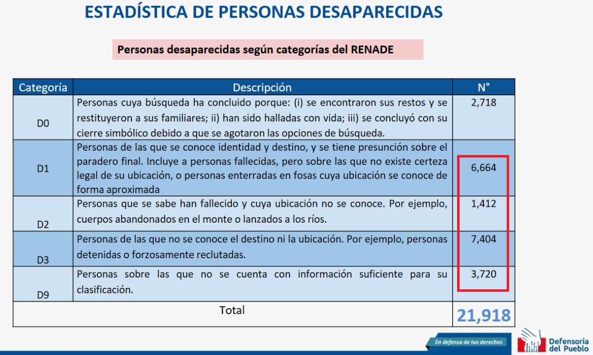 Entre los aun desaparecidos, 7404 fueron detenidos o reclutados forzosamente. De ellos se desconoce el destino y su ubicación. Y, finalmente, hay 3720 sobre las que no se cuenta con información suficiente para su clasificación. La Defensoría del Pueblo destacó en su reciente balance que la búsqueda se realiza a paso lento, debido, sobre todo, a la falta de presupuesto y al compromiso integral del Estado.