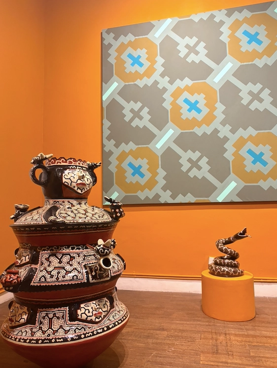 El recorrido por «Río Corrientes» es también un viaje por los imaginarios de la Amazonía. En las paredes y vitrinas uno puede ver cómo conviven las líneas geométricas del kené shipibo-konibo, las figuras místicas de la cerámica tradicional y las abstracciones contemporáneas. En las mesas se mezclan pigmentos naturales, arcilla y pinceles, como materiales que respiran el ritmo del bosque.