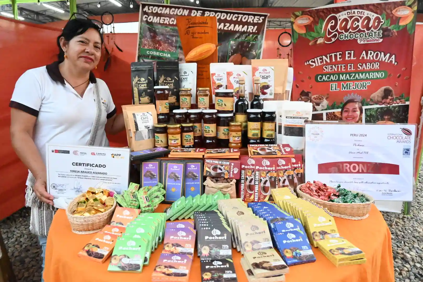 La feria cuenta con más de 100 stands, que exhiben la rica diversidad de la zona. Entre los expositores se encuentra Teresa Arauco, presidenta de la Asociación de Productores Comercio Justo Mazamari, quien ofrece una amplia gama de productos derivados del cacao y café. Arauco comentó a Inforegión: