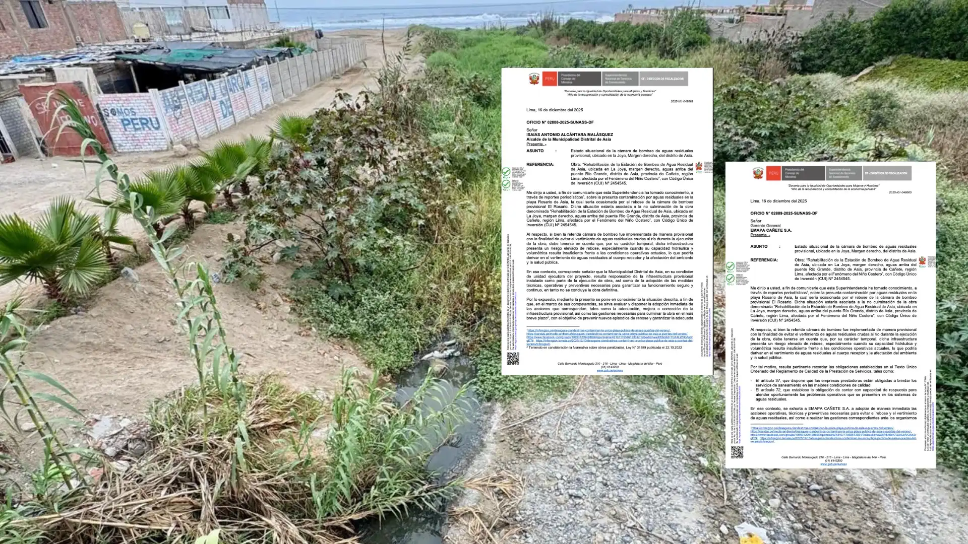 Lo inusual de estos documentos oficiales es que la Sunass fundamenta su intervención directamente en la evidencia periodística. En los oficios N° 02888 y 02889-2025-SUNASS-DF, la entidad cita los enlaces de las investigaciones tituladas «Desagües clandestinos contaminan la única playa pública de Asia a puertas del verano», validando así la gravedad de lo expuesto por la prensa.